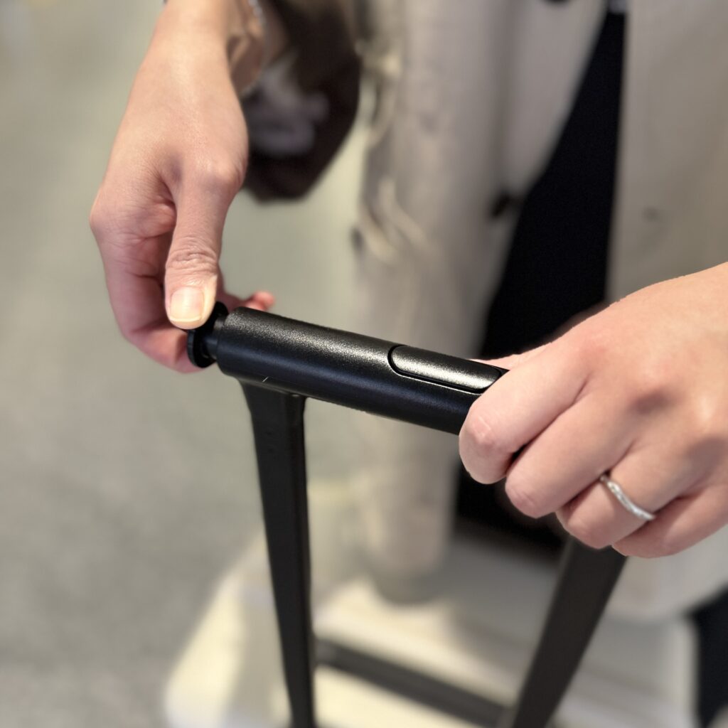 - 剎車控制鈕 – 剎車機制隱藏在拉桿下方,很美。而且是hinomoto的手動剎車,方便又實用! 出遊搭車接駁可以固定行李。 千萬不要買腳踩輪子上的剎車那種,託運時很容易斷