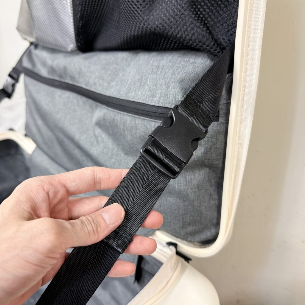 with me 把X型束帶的固定處做在箱底,即使衣服少少也可以束帶收緊讓衣服不移位
