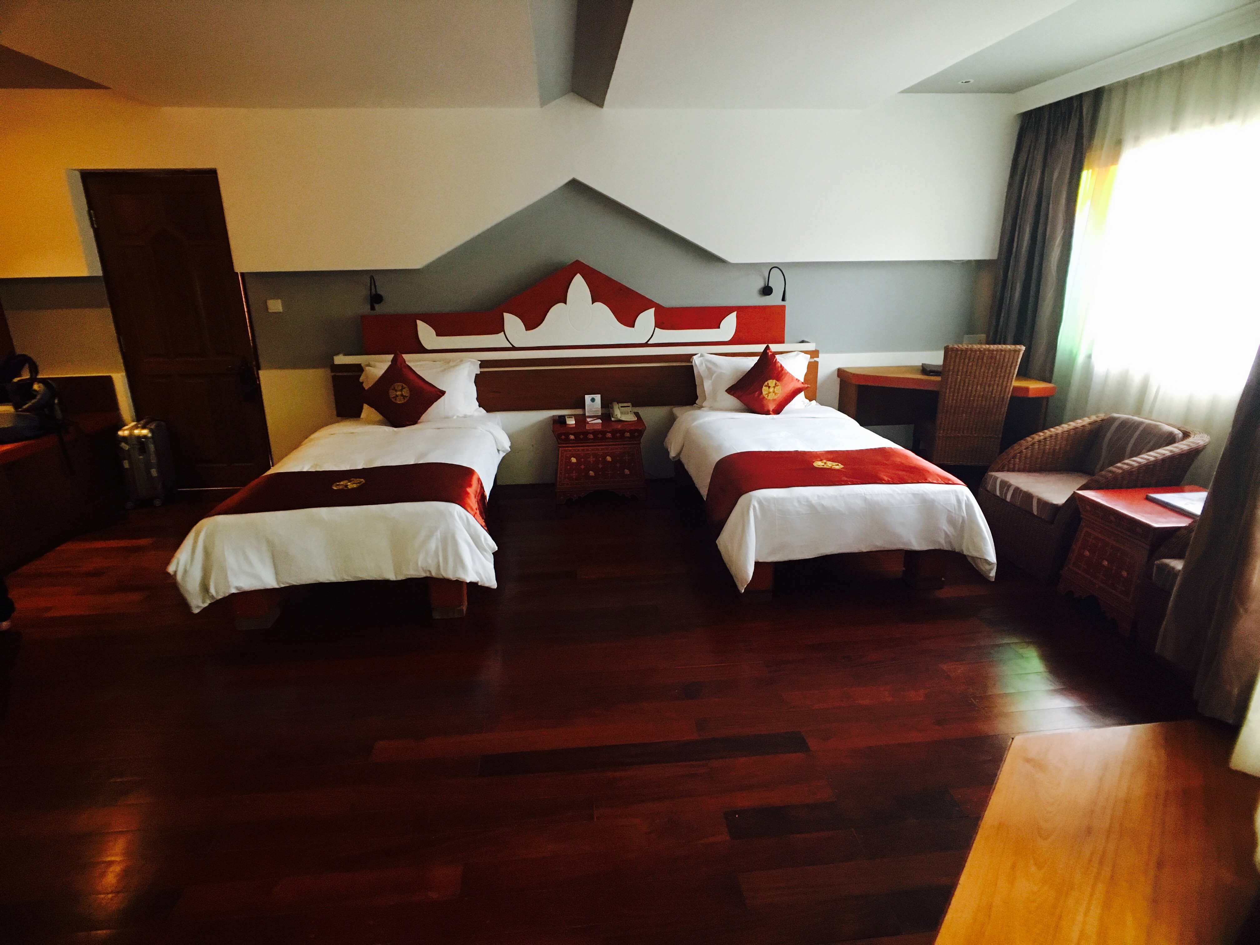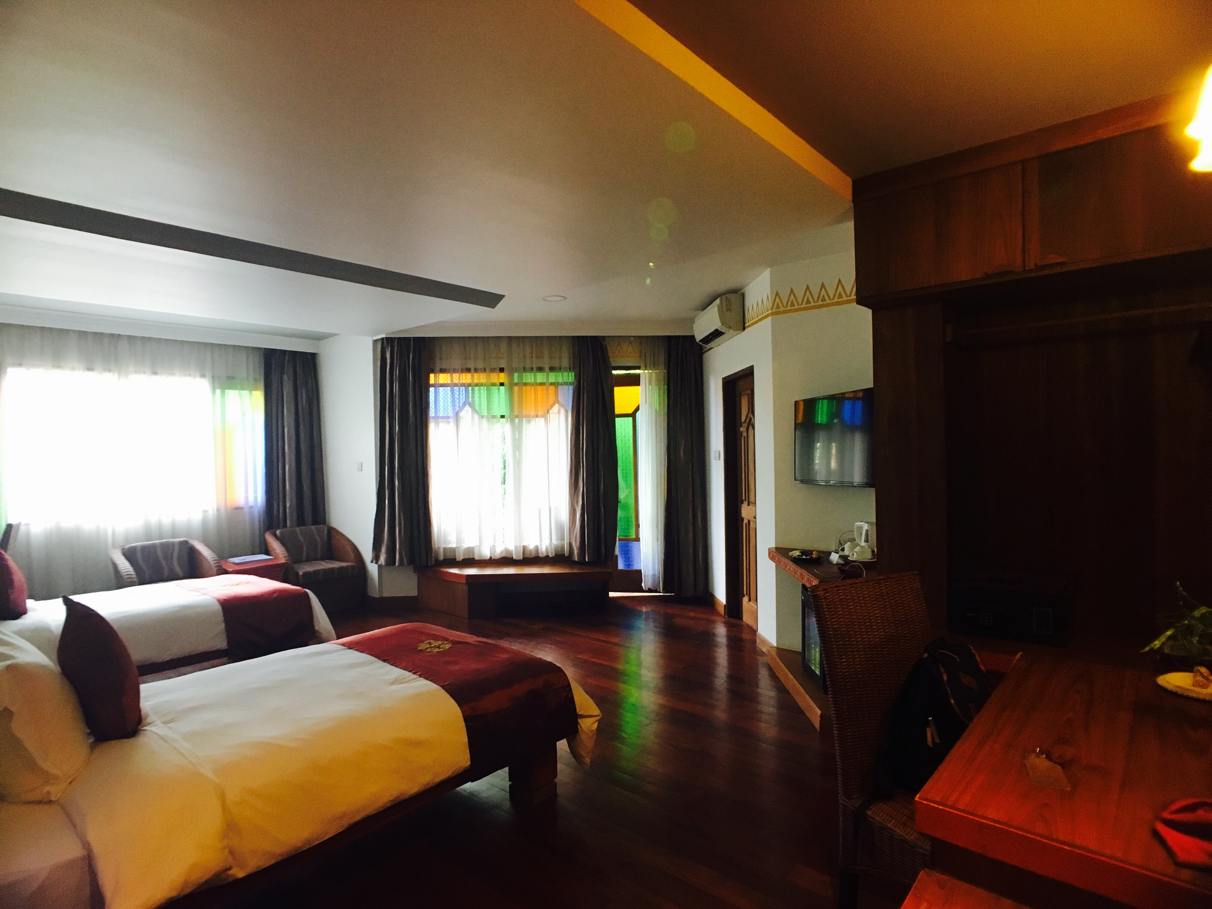 真的很不可思議,一晚才1150台幣,房間跟浴室大到覺得走來走去拿東西有點遠。住二樓最好,還有個大陽台。帶房的人說mini bar 隨你喝,免費的。後來發現,喝完他們還會自動回補…..
